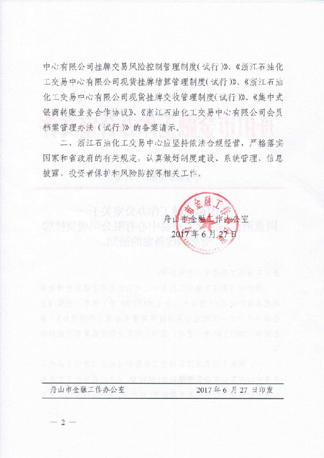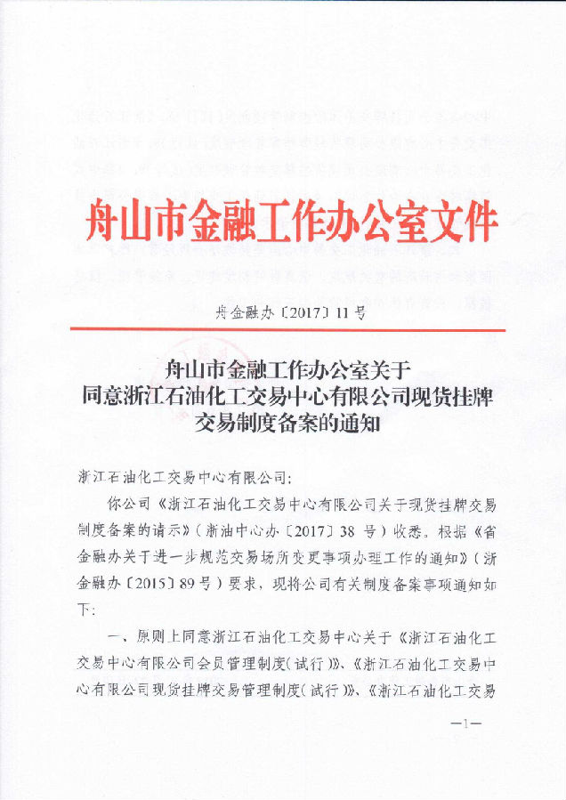 舟金融辦〔2017〕11號 關(guān)于同意浙江石油化工交易中心有限公司現(xiàn)貨掛牌交易制度備案的通知