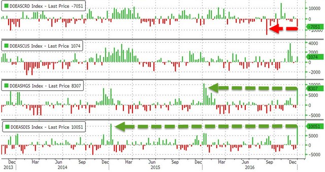 EIA今日公布上周美國(guó)原油庫(kù)存減少705.1萬(wàn)桶,至4.79億桶,降幅1.5%,創(chuàng)2016年9月8日來(lái)最大降幅,市場(chǎng)預(yù)估減少215.2萬(wàn)桶。美國(guó)原油交割地庫(kù)欣庫(kù)存增加107.4萬(wàn)桶,觸及去年5月來(lái)最高水平。最新庫(kù)存數(shù)據(jù)短線一度拉低油價(jià)。
